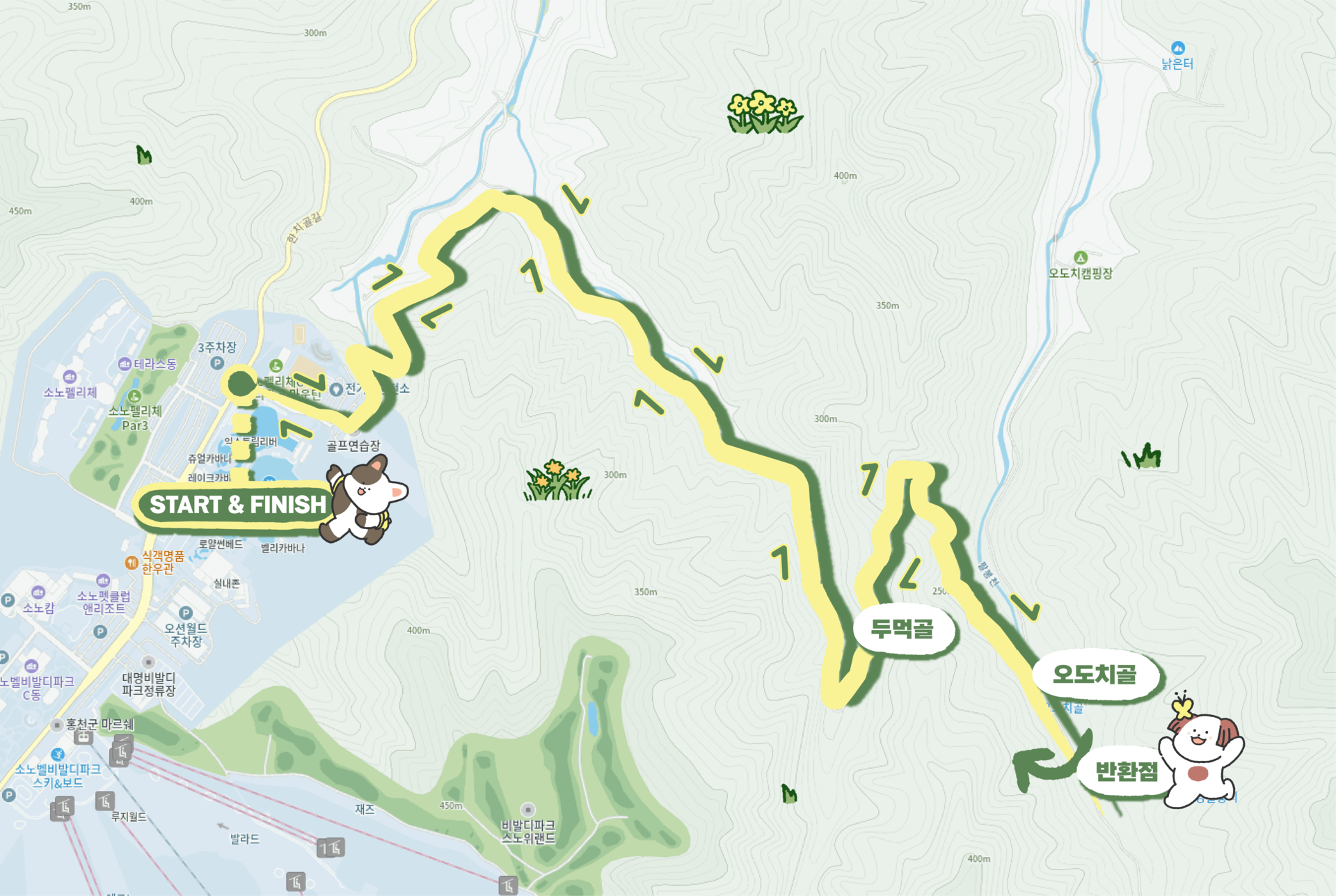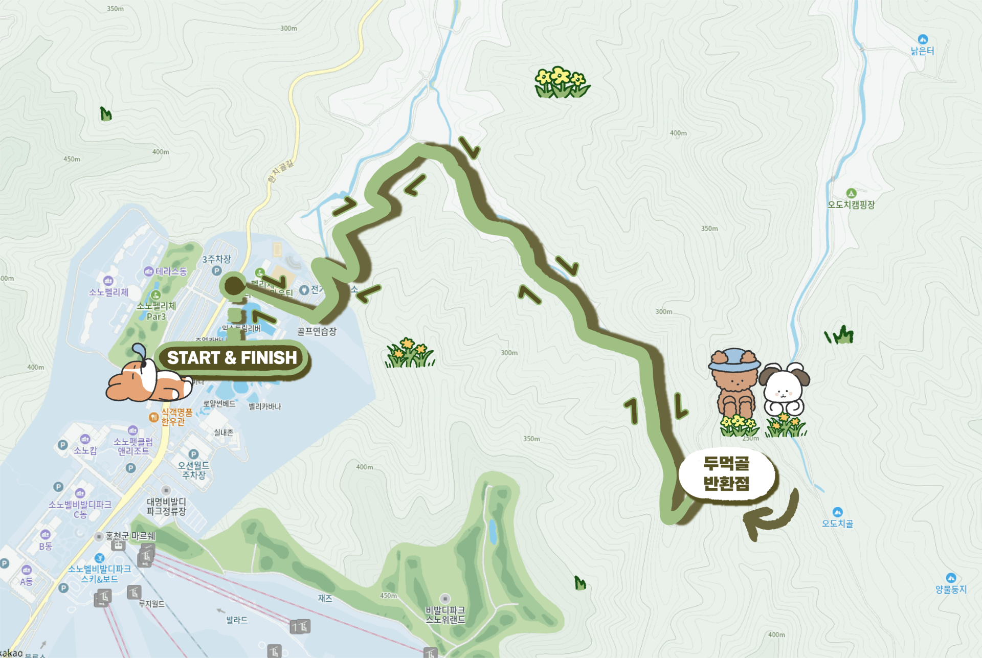 → 두먹골 → 오도치골 인근(반환) → 소노벨 비발디파크 후문(FINISH)